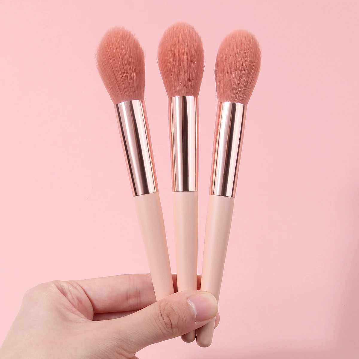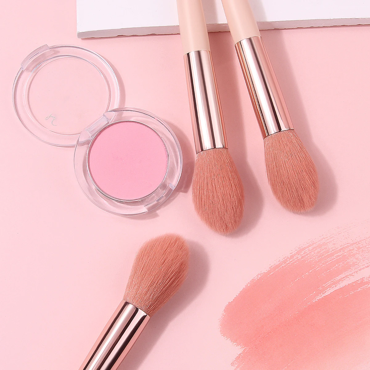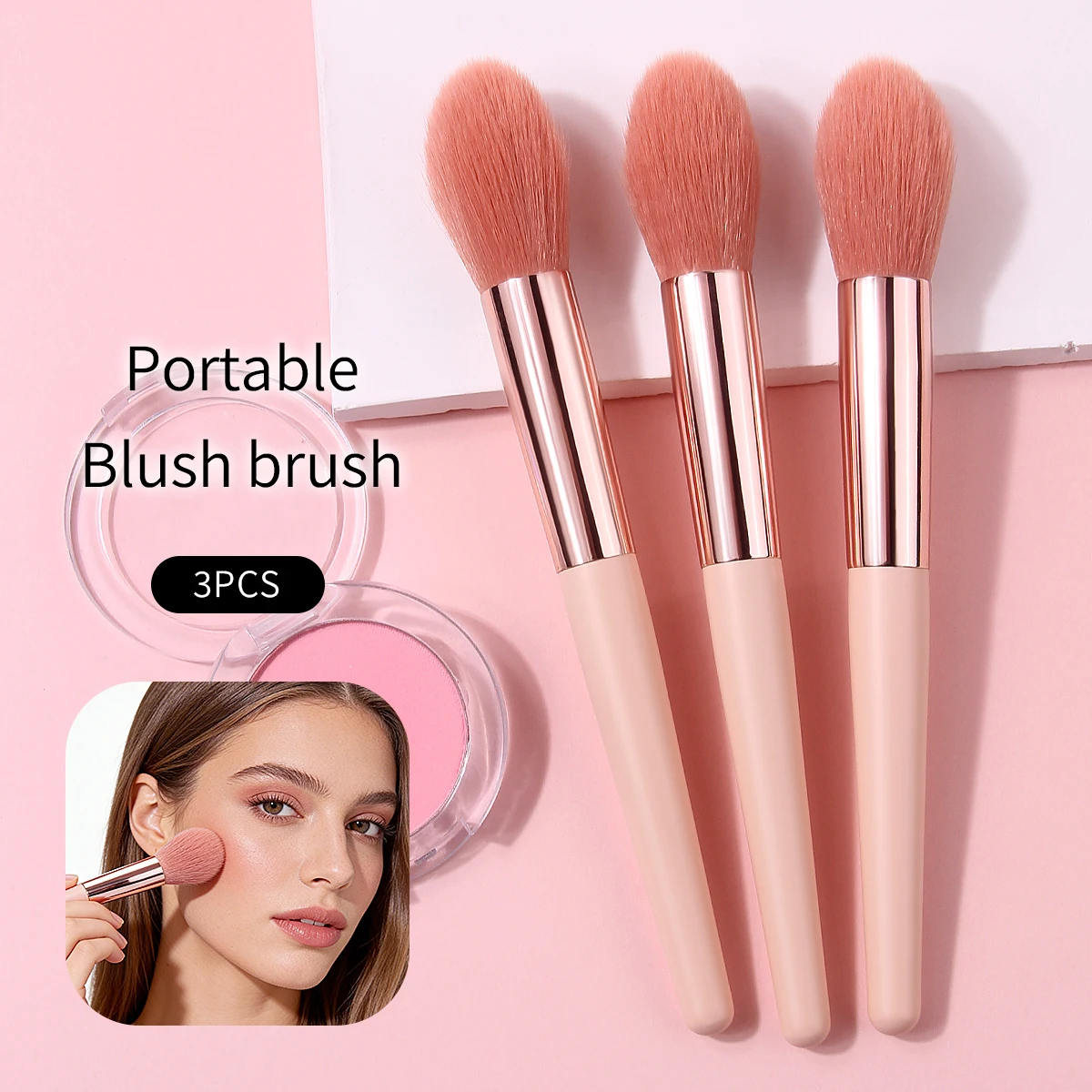 3 pieces of soft fiber makeup brushes: blush brush, powder brush, contour brush and contouring brush, all for makeup application
