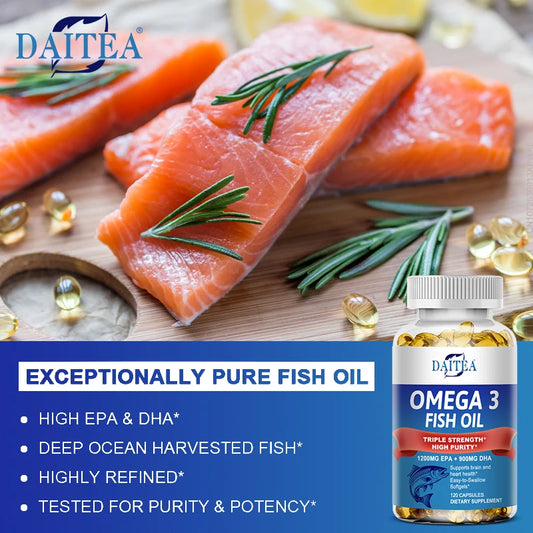 Daitea Omega 3 Fish Oil Capsules - for Nervous System, Skin and Hair Health, Antioxidants - Easy To Swallow