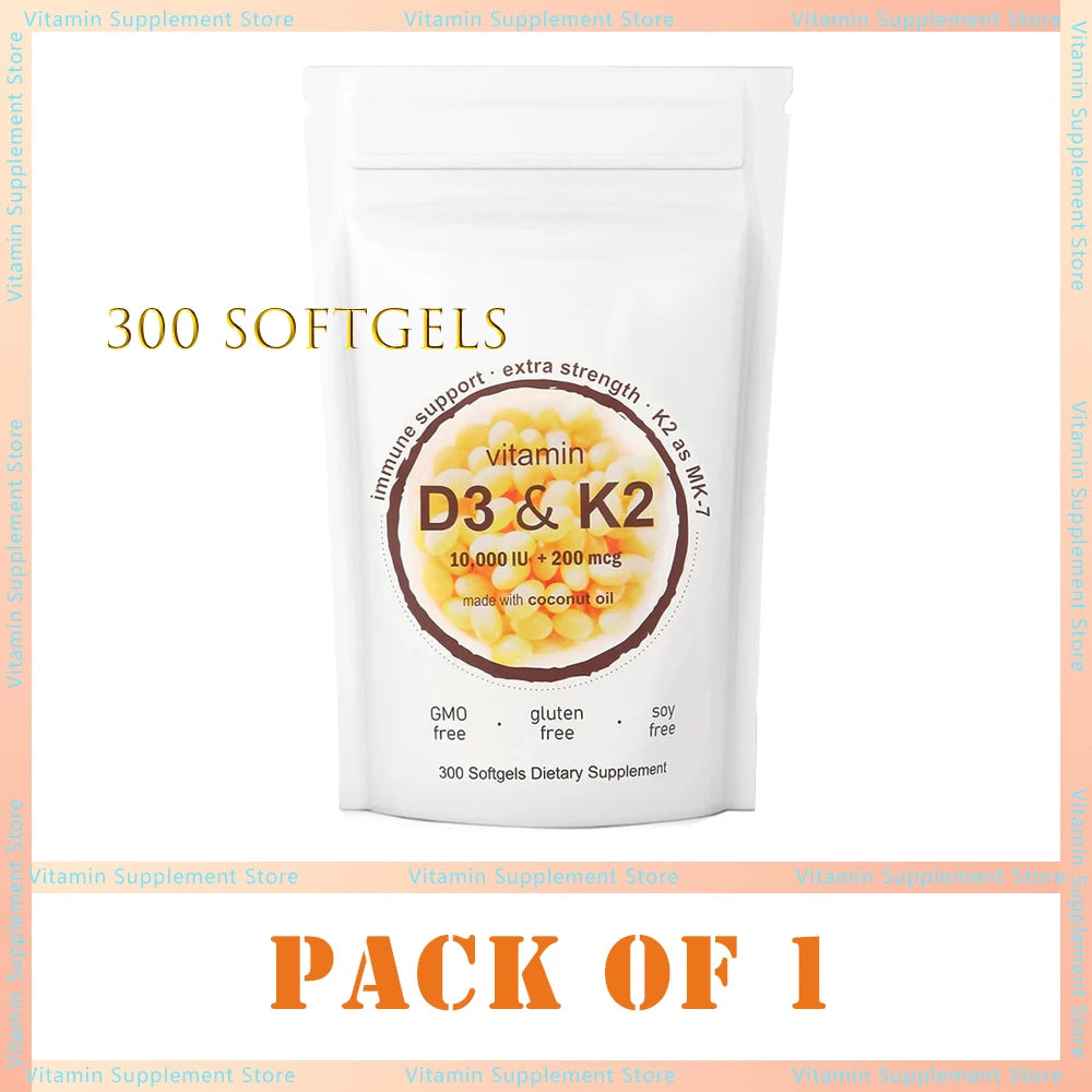 Vitamin D3 K2 10000 IU 300 Coconut Oil Softgels, 2 in 1 Vitamins Supplement D & K (MK7) Supports Calcium Absorption, Bone Health