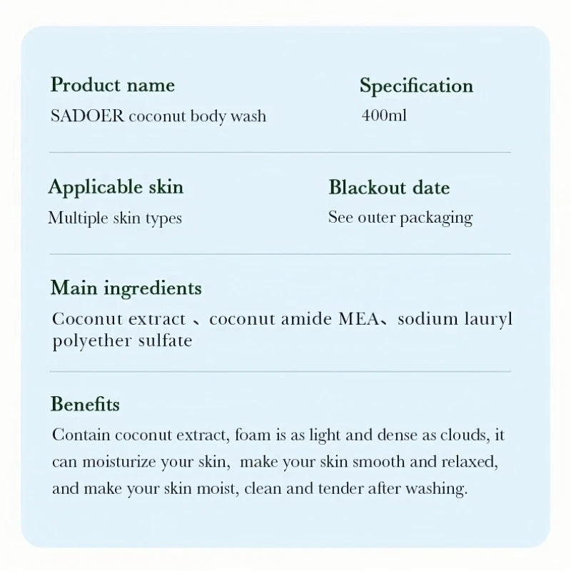 400ml Mild Coconut Shower Gel, Rich in Coconut Extract, Coconutamide Mea and Other Ingredients, with a Rich Coconut Scent, Long-Lasting Fragrance after Use, Light Foam Like a Cloud, Both Dense and Delicate, It Can Moisturize